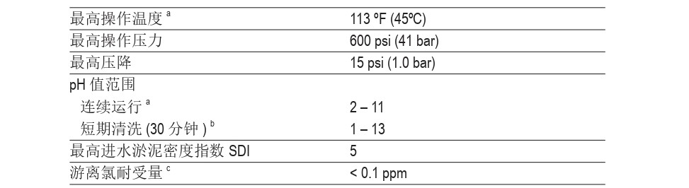 ● c 在某些條件下,游離氯和其他氧化劑的存在會導(dǎo)致膜片過早失效。由于氧化損壞不在質(zhì)保范圍內(nèi),杜邦水處理解決方案建議用戶在殘余游離氯接觸膜片之前通過預(yù)處理將其去除。 更多信息請參考進水脫氯(文件號 45-D01569-en)