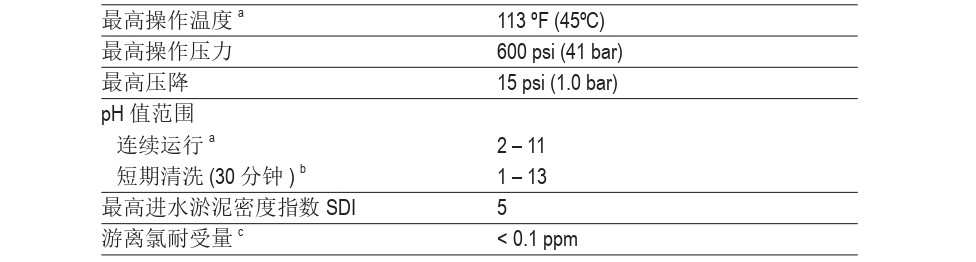 ● c 在某些條件下,游離氯和其他氧化劑的存在會(huì)導(dǎo)致膜片過早失效。由于氧化損壞不在質(zhì)保范圍內(nèi),杜邦水處理解決方案建議用戶在殘余游離氯接觸膜片之前通過預(yù)處理將其去除。 更多信息請(qǐng)參考進(jìn)水脫氯(文件號(hào) 45-D01569-en)