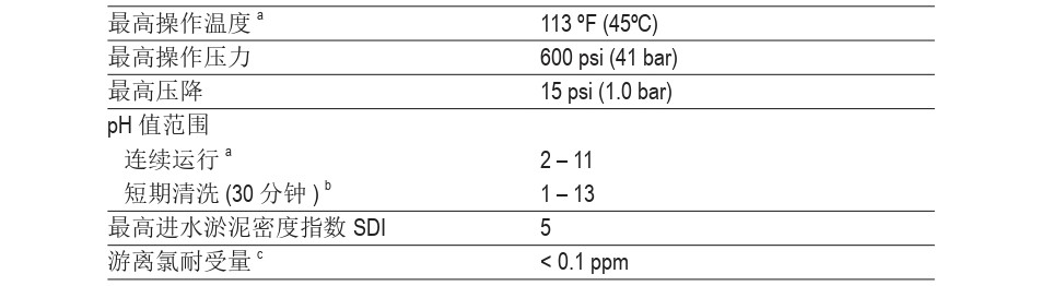 ● c 在某些條件下,游離氯和其他氧化劑的存在會(huì)導(dǎo)致膜片過(guò)早失效。由于氧化損壞不在質(zhì)保范圍內(nèi),杜邦水處理解決方案建議用戶在殘余游離氯接觸膜片之前通過(guò)預(yù)處理將其去除。 更多信息請(qǐng)參考進(jìn)水脫氯(文件號(hào) 45-D01569-en)