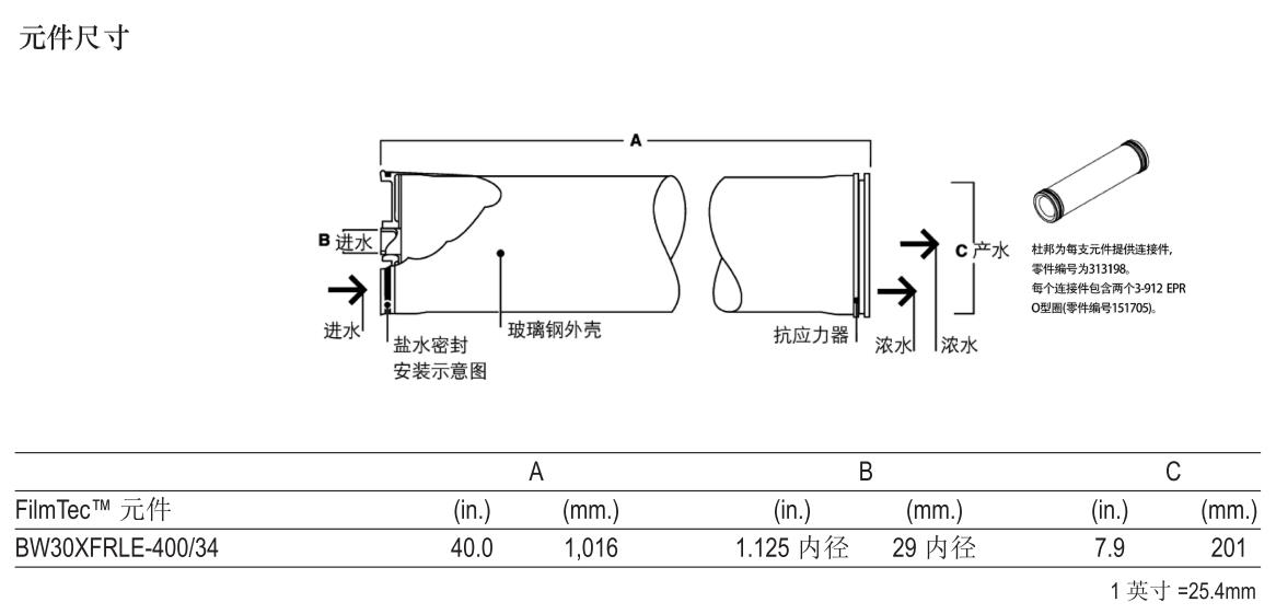 ● 膜元件配合公稱內(nèi)徑為8英寸(203mm)的壓力容器